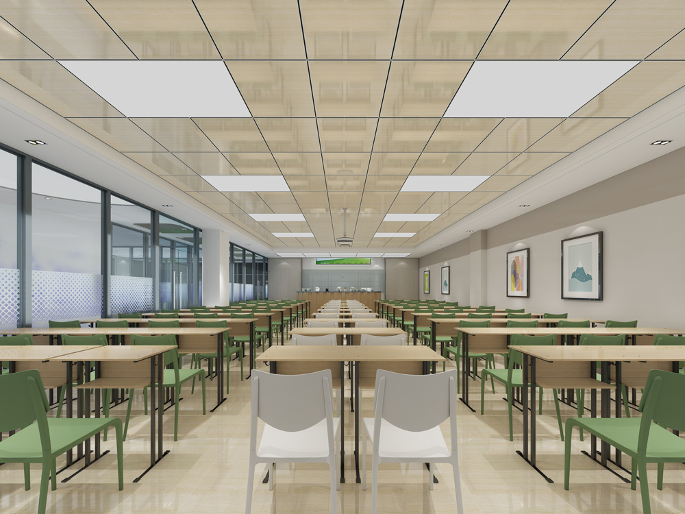 在大教室里,設計師要營造的是活躍的氛圍,椅子選用兩個顏色組合,錯開擺放不會顯得過于沉悶。綠色又是代表著生機的顏色,勃勃生機,欣欣向榮,對保護孩子視力也有很大幫助。