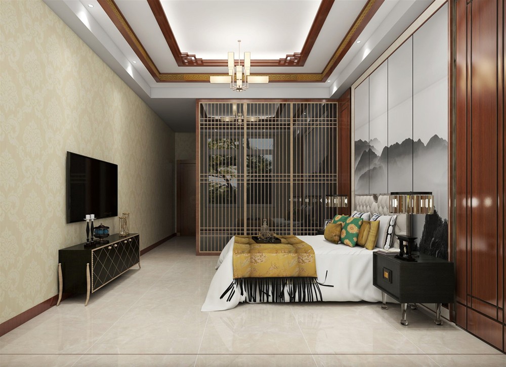 主臥床背景仍利用木色為主構架融會貫通,再加以富有意境的山水壁畫作為更深層的點綴,讓人們在整個空間里感受傳統文化帶來的熏陶與動感,生命也變得溫潤充盈,富有韻味。
