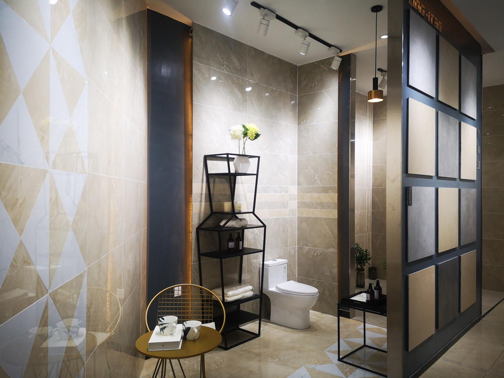 這是選材區,打豎的陳列方式射燈下的產品,直觀、整潔、大氣、很好地凸顯產品的紋理,推拉陳列方式主要針對噴墨瓷片,簡單一堵墻就能把噴墨瓷片的搭配、鋪貼、風格直觀呈現。