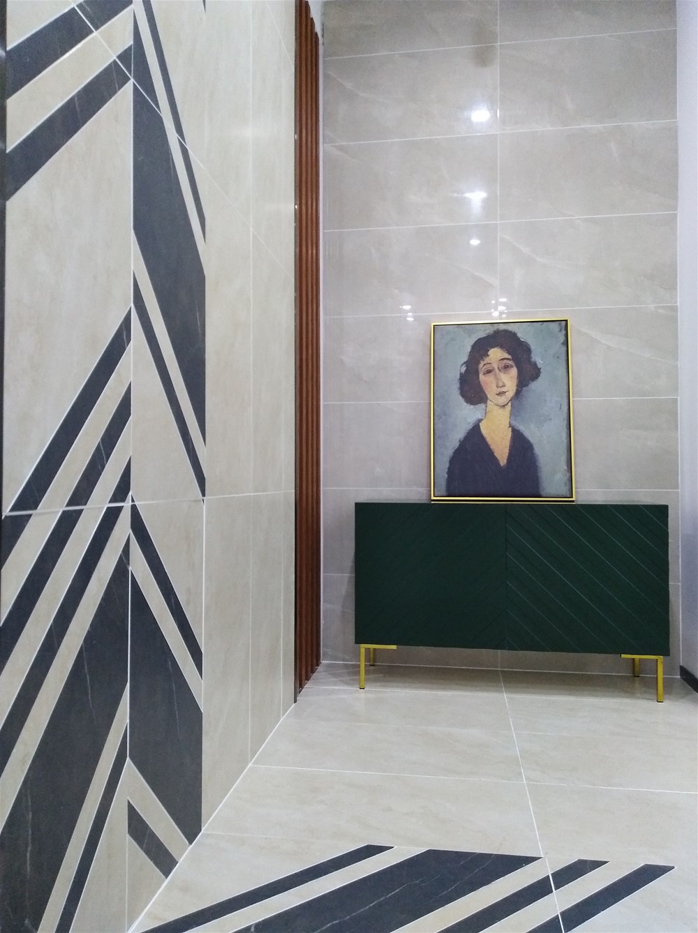 這是現(xiàn)代簡約風格玄關,正面墻由通體大理石KT9832凱羅地灰鋪貼,玉石的質(zhì)感溫潤細膩,側(cè)面墻則由15°緞光釉KFD8803泰坦米黃與KFD8808保級利亞灰切割鋪貼,正面正鋪與側(cè)面墻切割鋪貼,繁與簡結(jié)合,亮面與柔光面搭配,不會造成視覺疲勞又不至于太單調(diào)。