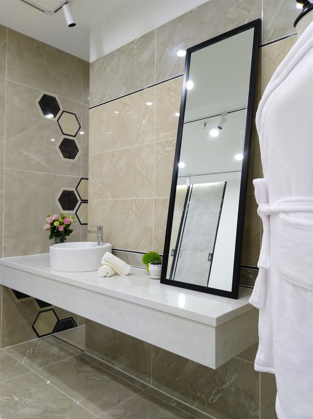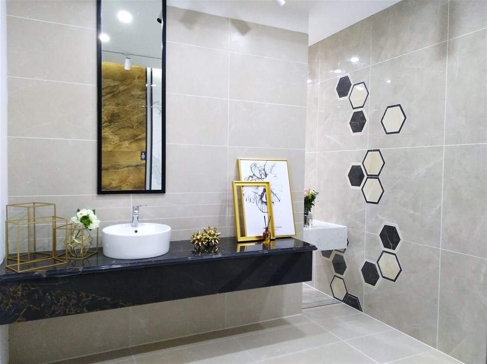 以下三個都是現(xiàn)代簡約風格的衛(wèi)生間,都一致選用了米黃色的瓷磚切割成300*600進行鋪貼,300*600規(guī)格適用于小面積,我們展廳也有專門廚衛(wèi)用的配套噴墨瓷片。拋開軟裝來看這是一個普通的衛(wèi)生間,但搭配對了軟裝,就提升了一個檔次,所以說軟裝和硬裝是起到了相得益彰的效果。