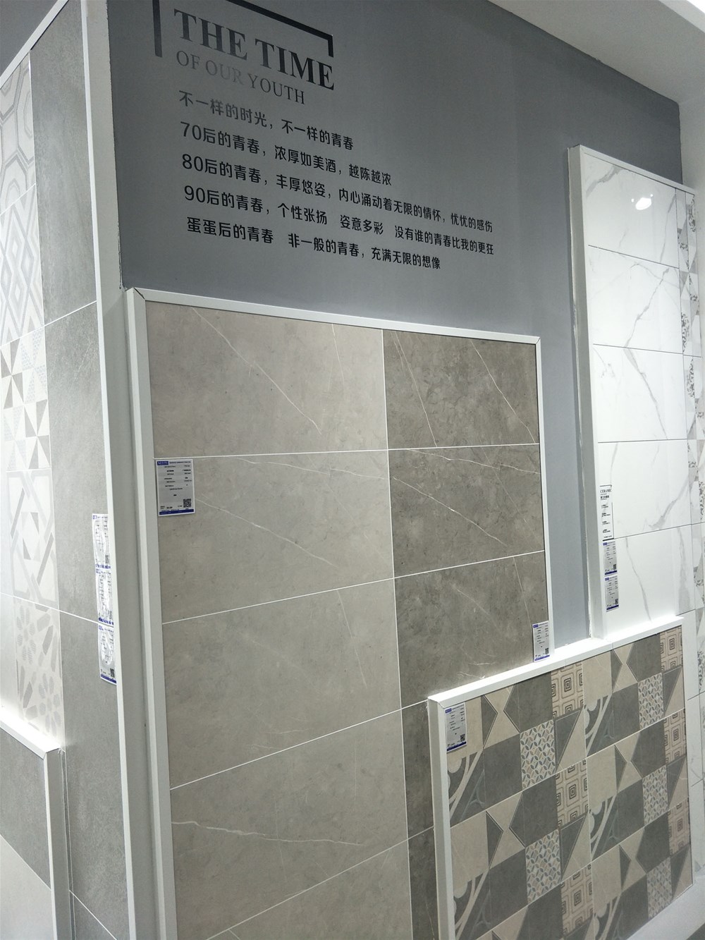 這是我們配套噴墨瓷片的展示墻,花片、小地磚、腰線、瓷片一應(yīng)俱全,廚房、衛(wèi)生間、陽臺(tái)等空間都適用,讓你完全省掉了搭配的麻煩。
