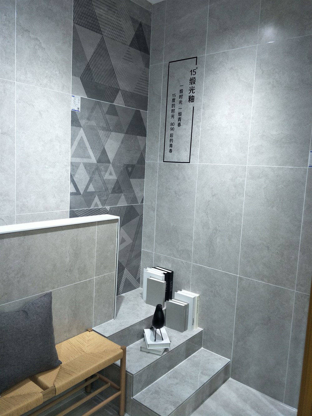 這也是15°緞光釉KFD8806銀線灰洞與KFD8806HP克洛諾斯灰搭配鋪貼的書房、休閑區(qū)。15°的護(hù)眼是我們這系列產(chǎn)品的亮點(diǎn),看著會(huì)比亮面磚更舒適,書房用磚選緞光釉就沒錯(cuò)了。