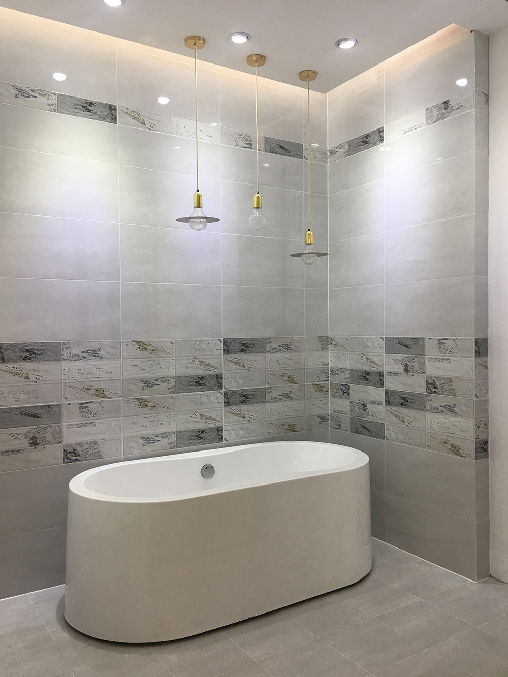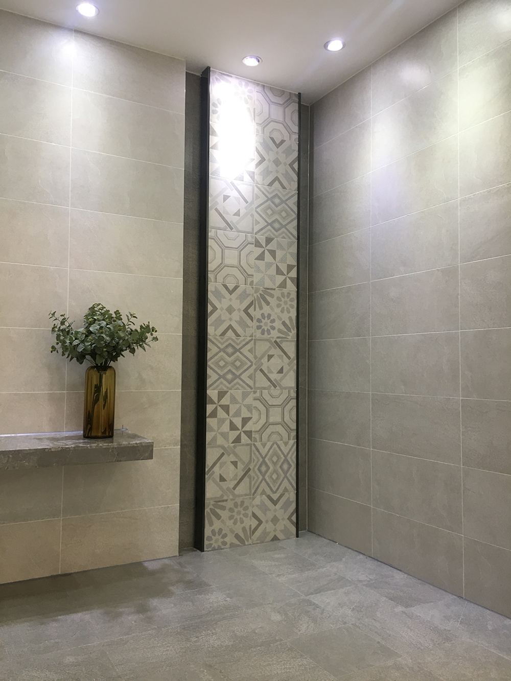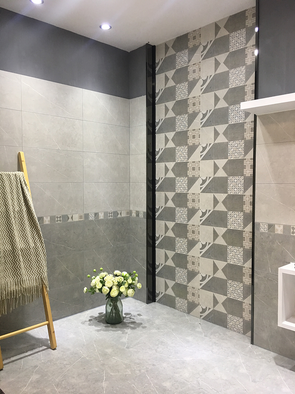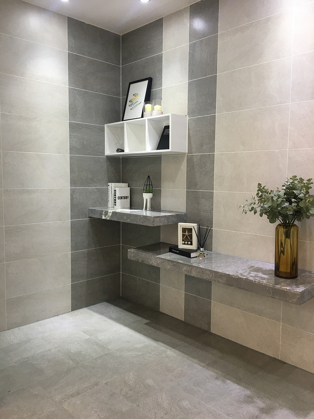 墻面由淺灰和深灰拼接鋪貼