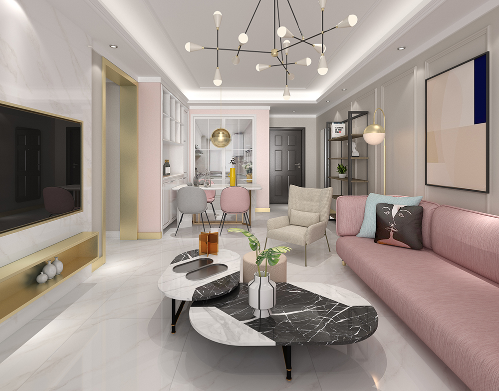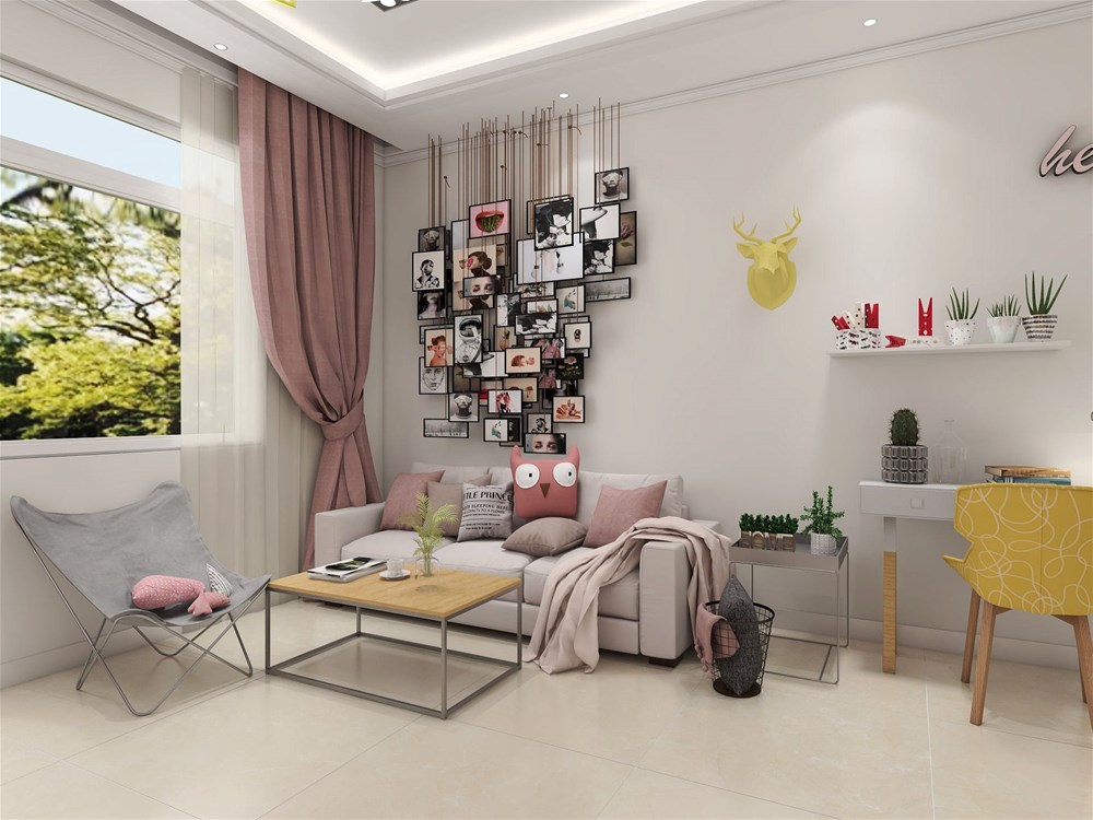 沙發(fā)墻上兩副簡(jiǎn)單的粉色調(diào)掛畫