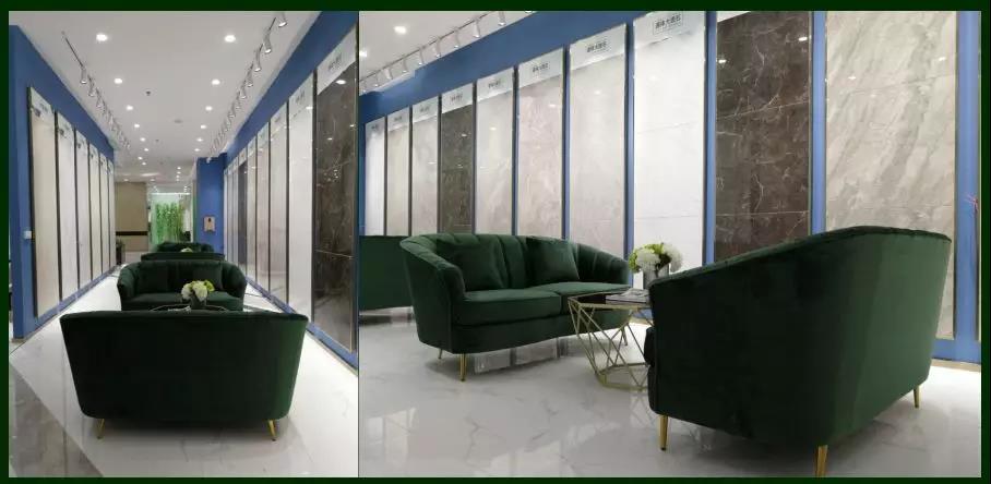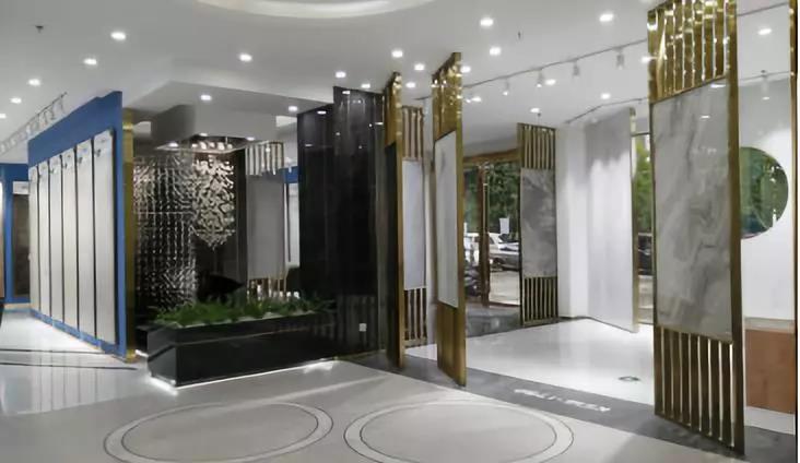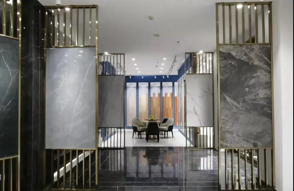 900*1800的大板以屏風的形式展現,不但很巧妙的體現了大巖板系列產品的紋理和設計感,而且通過系列的屏風展示很巧妙的把大堂區域兩邊劃分為接待區和洽談區,靜/動兩個區。