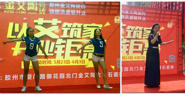 精彩的開場節目過后,金艾陶瓷磚品牌營銷總經理羅勝首先為本次開業活動致辭。羅總對金艾陶瓷磚山東膠州專賣店的盛大開業表示祝賀,同時也期望金艾陶瓷磚山東膠州專賣店能將更多好產品和好服務帶給膠州的消費者。隨后,金艾陶瓷磚山東膠州專賣店總經理李鵬飛為活動致辭。臺上歌舞繚繞,臺下座無虛席,熱鬧非凡。