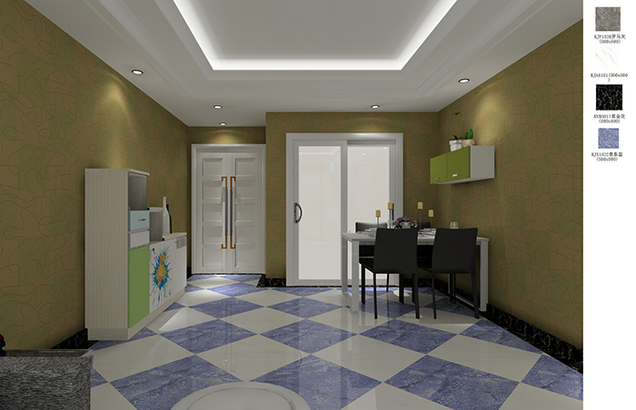地面以藍(lán)、白色為主,給人一種小清新的感覺(jué)。在瓷磚的鋪貼方式上也蠻是新意,地面的菱形鋪貼,電視背景墻的寬、窄長(zhǎng)條形鋪貼,讓家不在顯得單調(diào)無(wú)味。