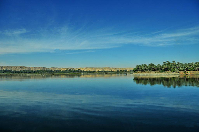 蜿蜒流淌的尼羅河,在黃色廣袤的沙漠中,猶如一條綠色的走廊,充滿著勃勃生機和無限希望。岸旁郁郁蔥蔥的灌木、連綿不絕的金黃色田野,在水中映出美麗的倒影,構成一幅如詩如畫的美麗畫卷。碧草茵茵,蘆葦搖曳,使人想起“蒹葭蒼蒼,白露為霜,所謂伊人,在水一方”的意境,想象著在氤氳的水氣中,一位佳人正款款走來。