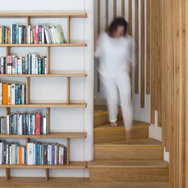 大面積的書架不一定是一成不變的,可以根據(jù)家里的特點(diǎn)而變化。高低起伏的書架邊緣為家里的小動(dòng)物創(chuàng)造出一個(gè)攀爬的空間,也是別于其他書架的特色之一。