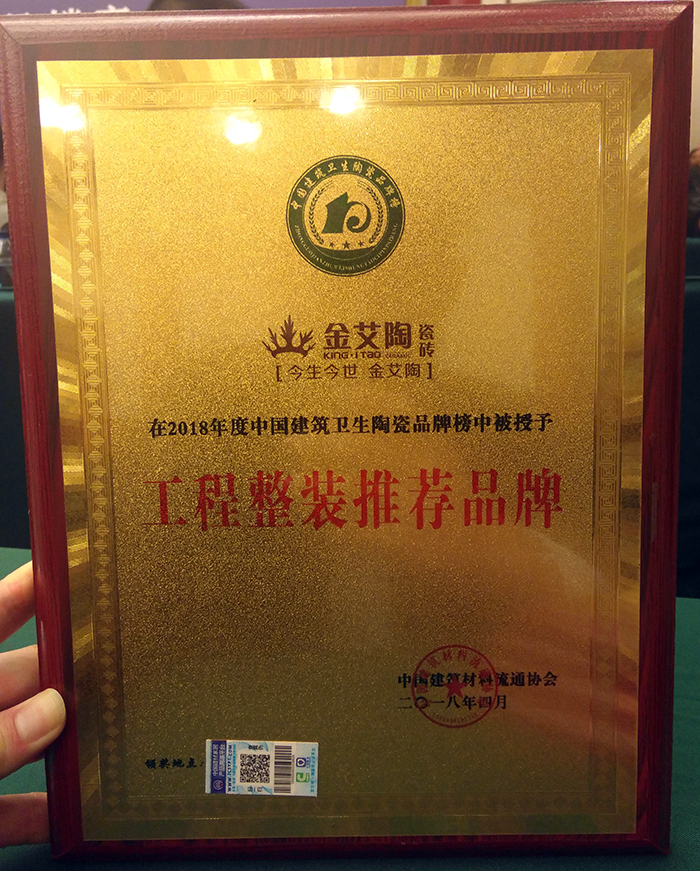 作為陶瓷行業后起之秀的金艾陶瓷磚品牌喜獲“陶瓷一線品牌”、“現代仿古磚十大品牌”、“緞光釉領軍品牌”、“設計師推薦品牌”、“工程整裝推薦品牌”等多項殊榮,其中更是連續五年獲得“陶瓷一線品牌”榮譽。在本次“行業兩會”的評選中,金艾陶瓷磚品牌能夠在眾多知名陶瓷企業中脫穎而出,證明金艾陶又一次獲得了行業內外的肯定。