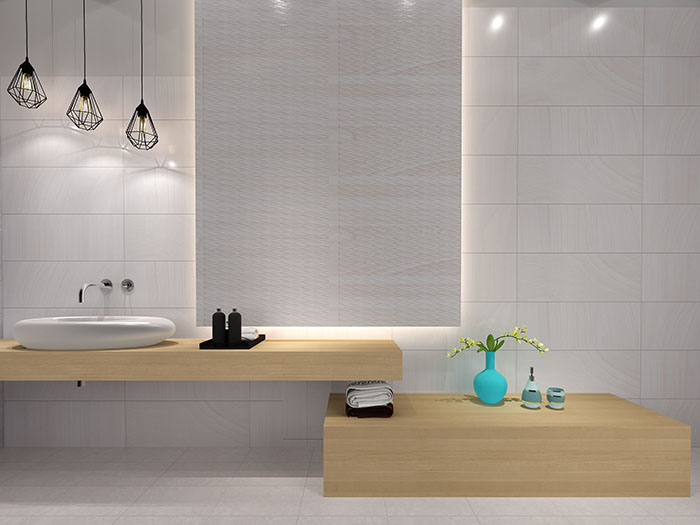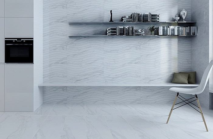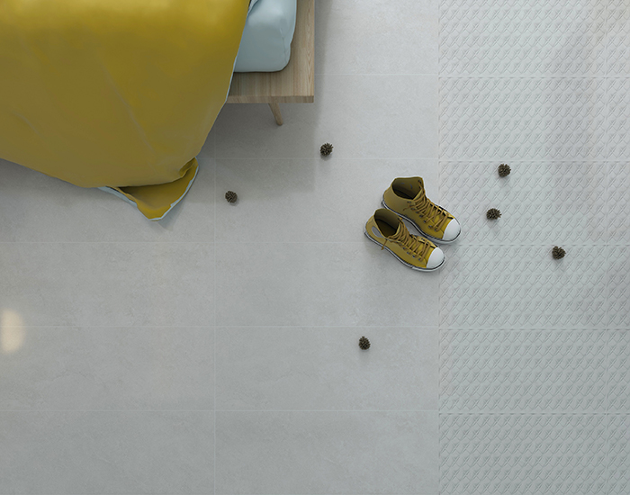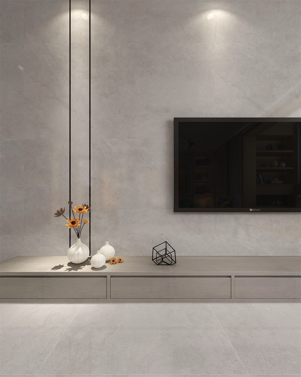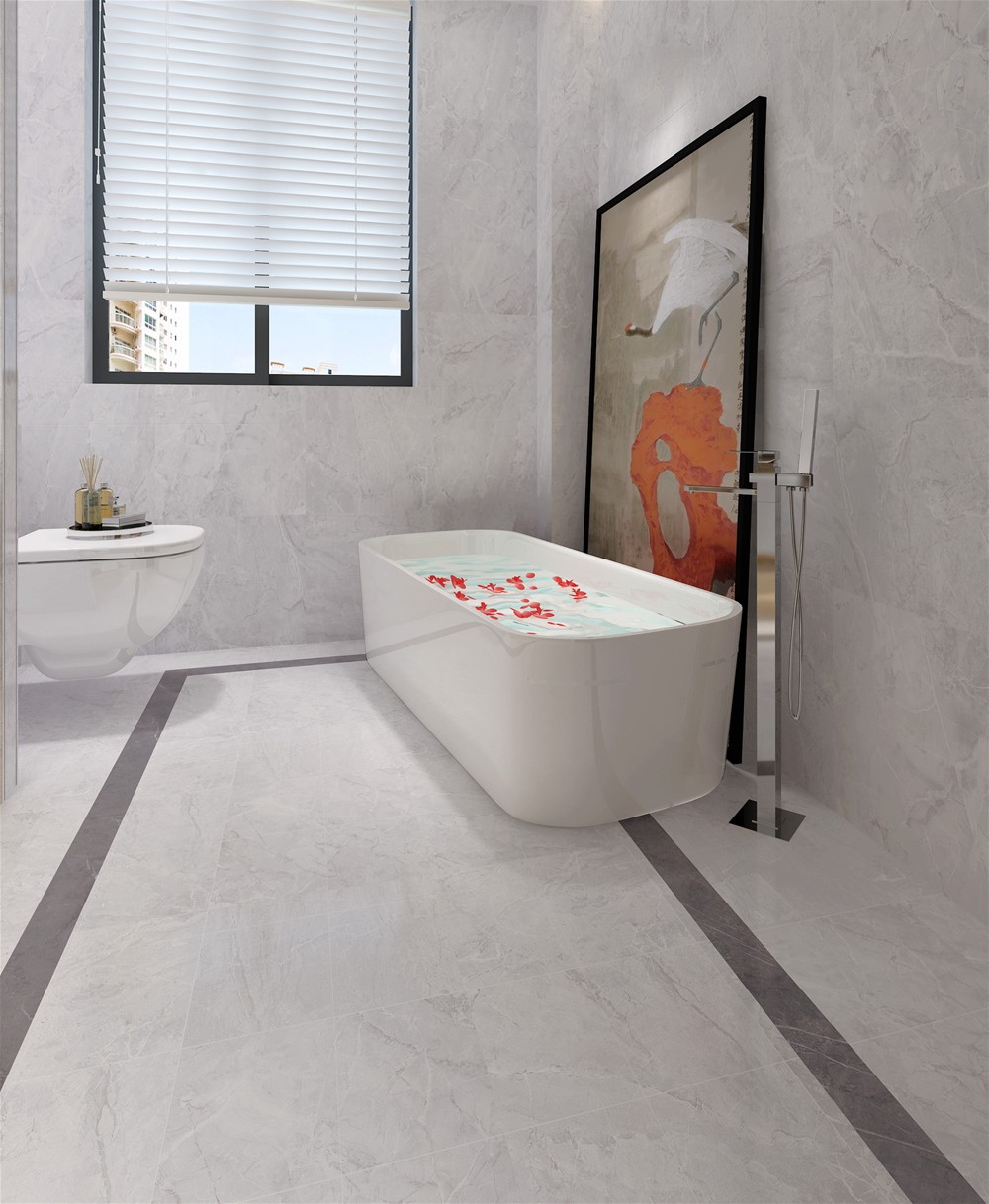 白色的表面素雅而寧靜,灰色線條橫跨其中,自然而純粹,色澤素凈大方,光感柔和自然,似乎是將一層薄薄的絲綢印刻在瓷磚的表面,縷縷輕絲纏繞,觸感舒適細(xì)膩,帶來如綢緞般絲滑體驗(yàn)。