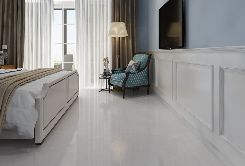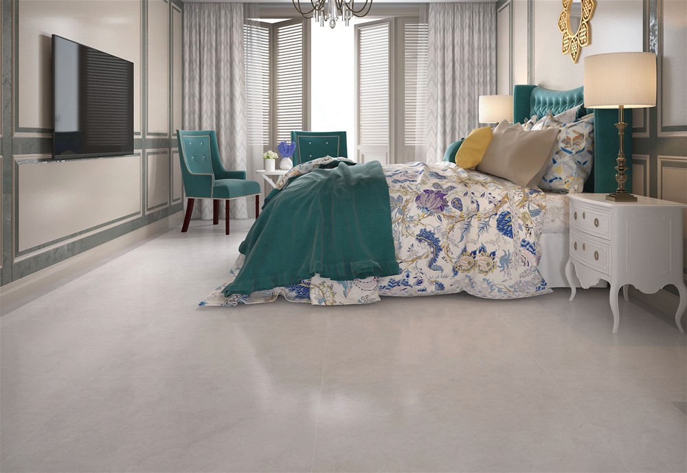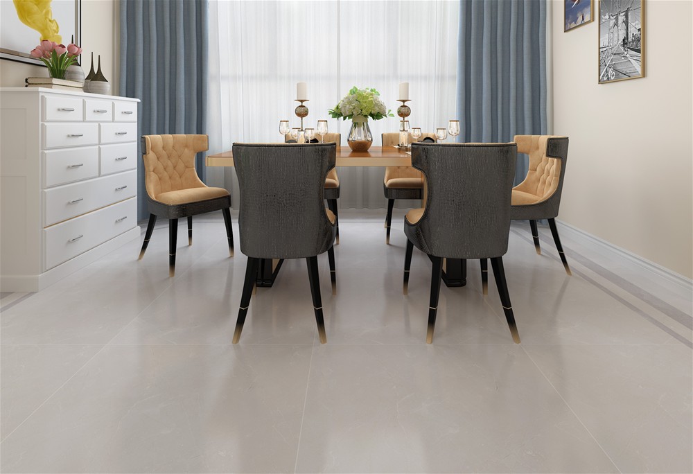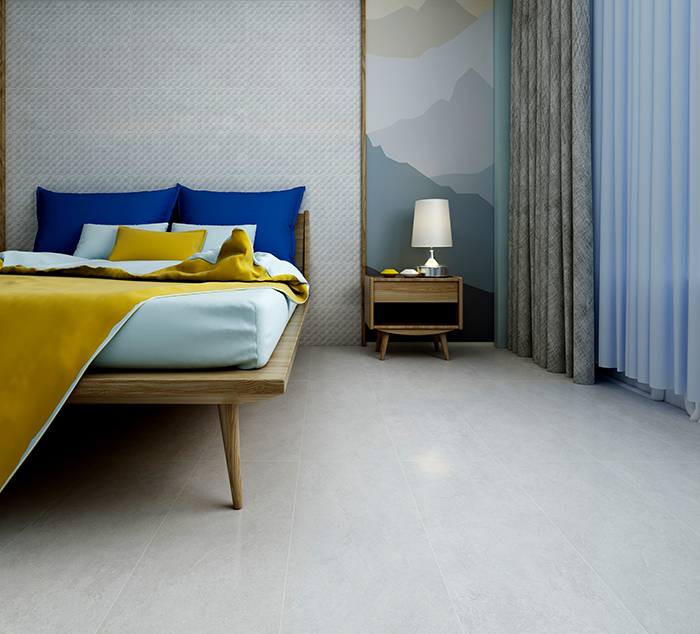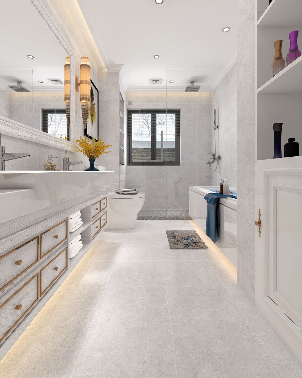 白色的表面素雅而寧靜,灰色線條橫跨其中,自然而純粹,色澤素凈大方,光感柔和自然,似乎是將一層薄薄的絲綢印刻在瓷磚的表面,縷縷輕絲纏繞,觸感舒適細(xì)膩,帶來如綢緞般絲滑體驗(yàn)。