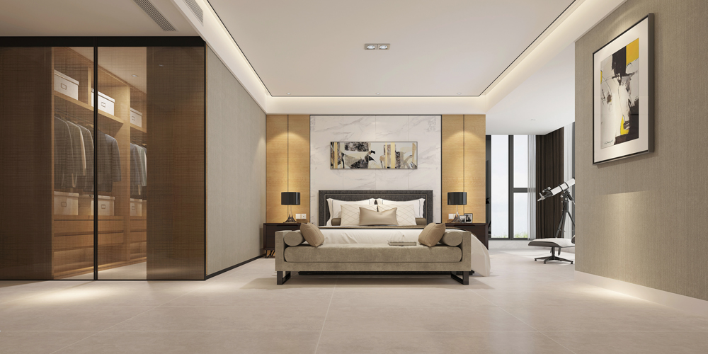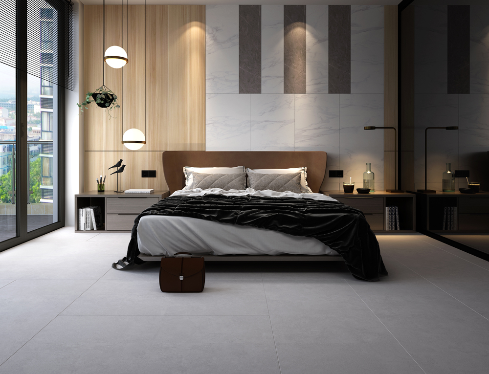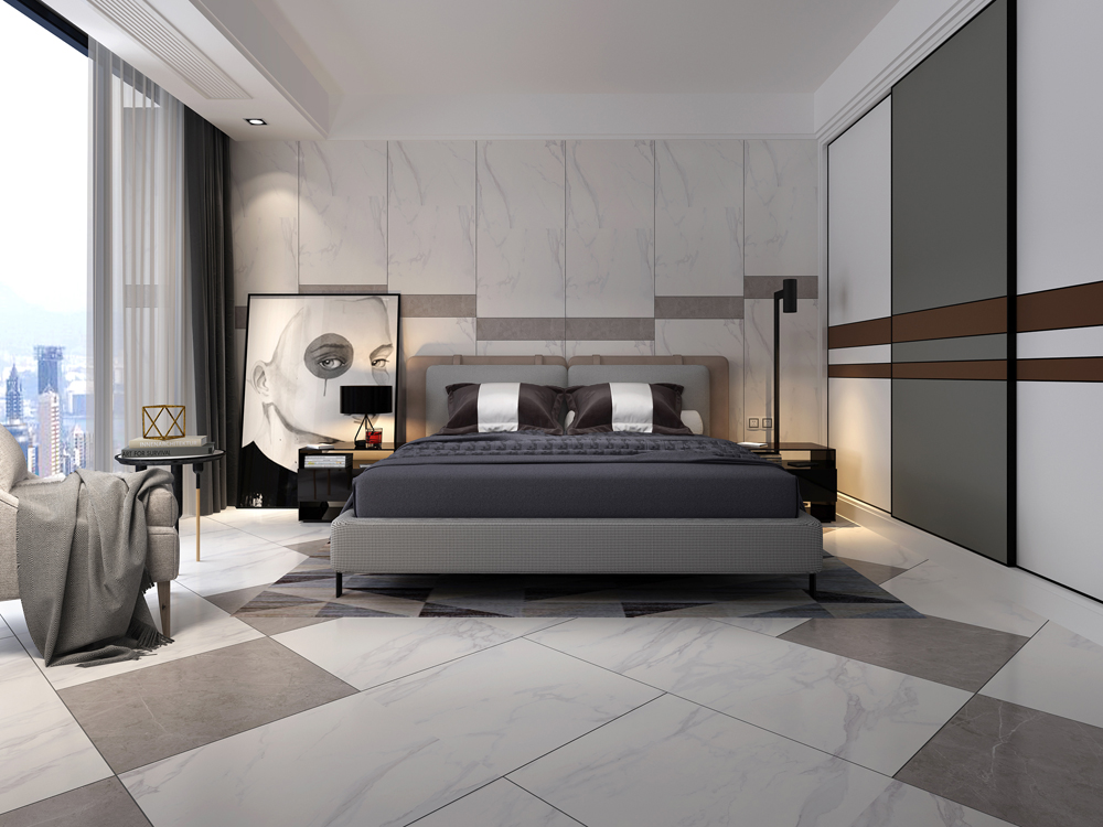 (15°緞光釉KFD126A01)錯(cuò)位鋪貼的鋪磚方式,凸顯空間層次感,床尾配有布藝沙發(fā),在窗邊看著這城市的日落和日出,一天都不會(huì)覺得枯燥。